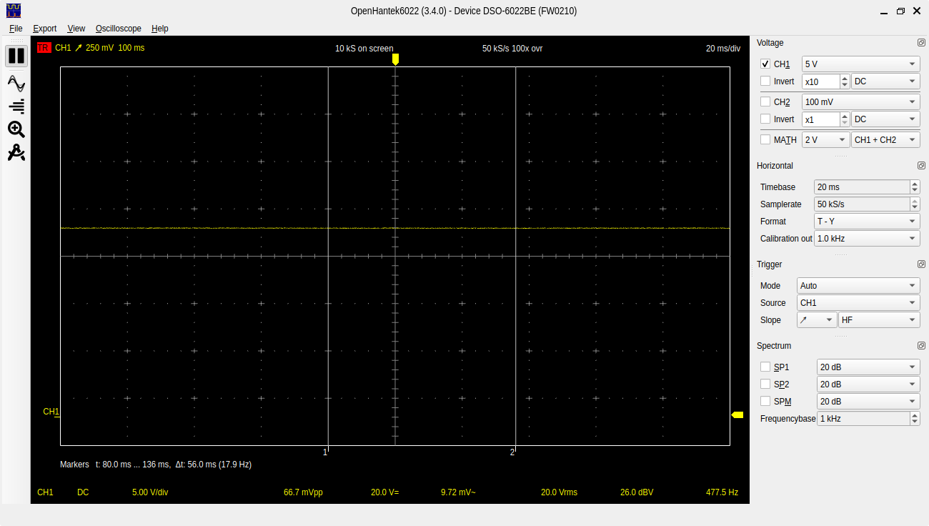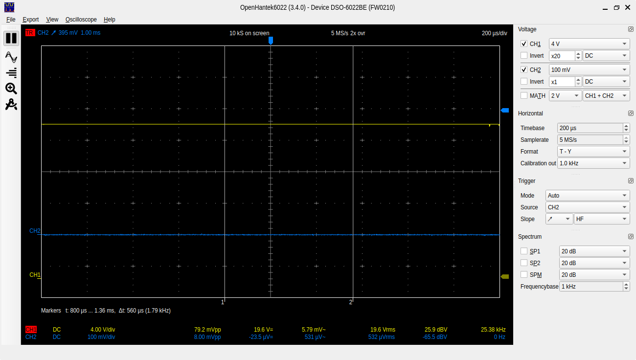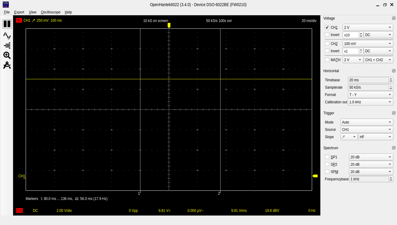 I bought a cheap Hantek 6022BE to learn with and I’m just trying to measure some voltage to check if it’s accurate. I’m using openhantek6022 github.com/OpenHantek/OpenHantek6022 and also hscope on android. I’m measuring a 19v laptop power supply with the 10x setting on the probe and also a set of leads with a 20x attenuator. When I measure the power supply with my dmm I’m getting 19.22V with the scope I’m getting much higher or lower depending on where I set the voltage per division. Both programs have a calibration function which I did.