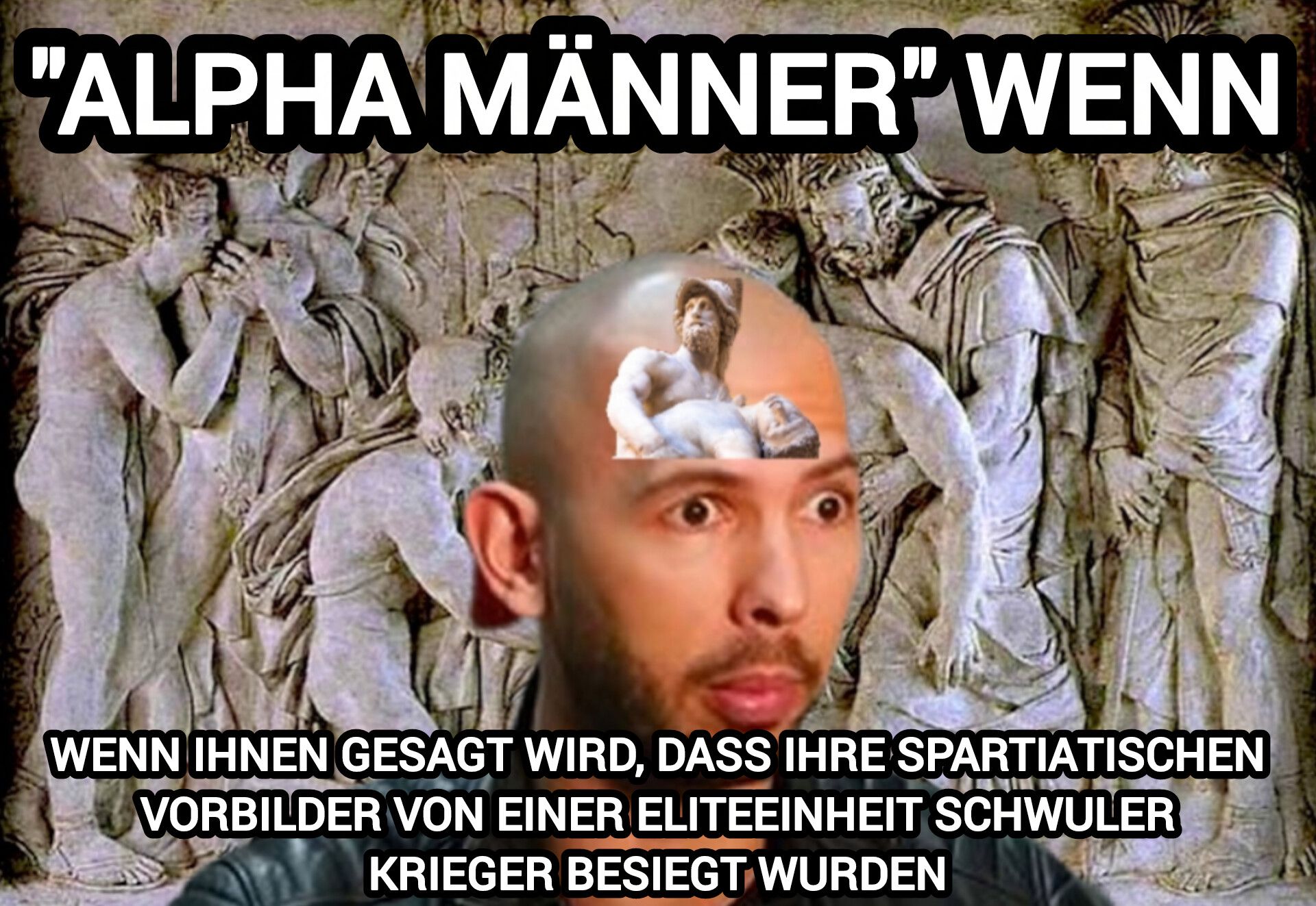 Die VergĂśtterung der spartiatischen Kriegerkultur ist unter âAlpha-Männernâ und in der Manosphere weit verbreitet. Eine weitere lustige Ironie ist, dass Anhänger und Verbreiter einer solchen homophoben Ideologie eine Kultur vergĂśttern, die von einer explizit schwulen Kriegereinheit besiegt wurde.