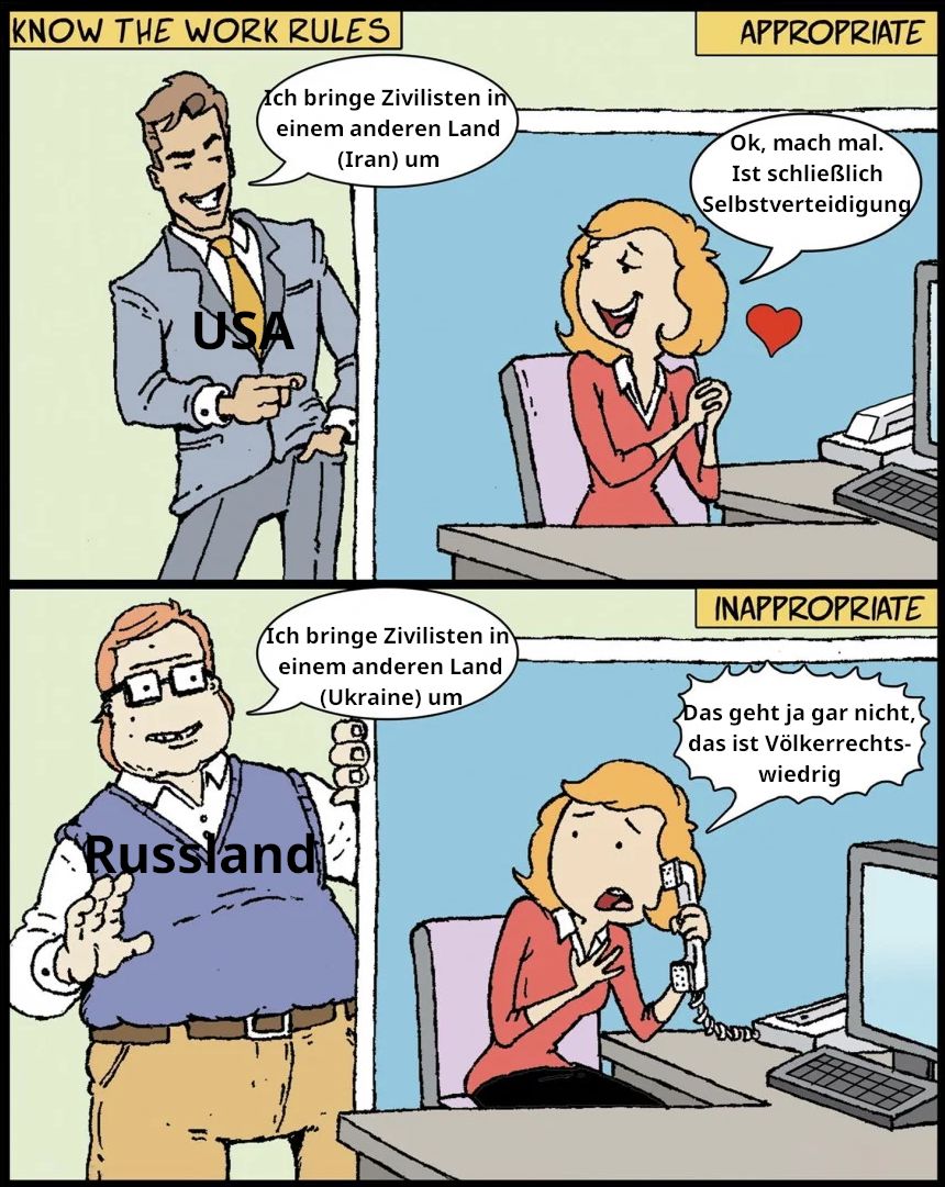 Ich bin einfach nur noch wuetend. Wie kann man als Weltgemeinschaft kollektiv den USA und Israel so hart die Eier lutschen, dass die einfach machen koennen was die wollen, ohne dass die Weltgemeinschaft auch nur mit der Wimper zuckt? Stattdessen verurteilt man dem Iran, wenn die zu Gegenschlaegen gegen US-Basen ansetzen, waehrend im Iran Schulen weggebombt werden.