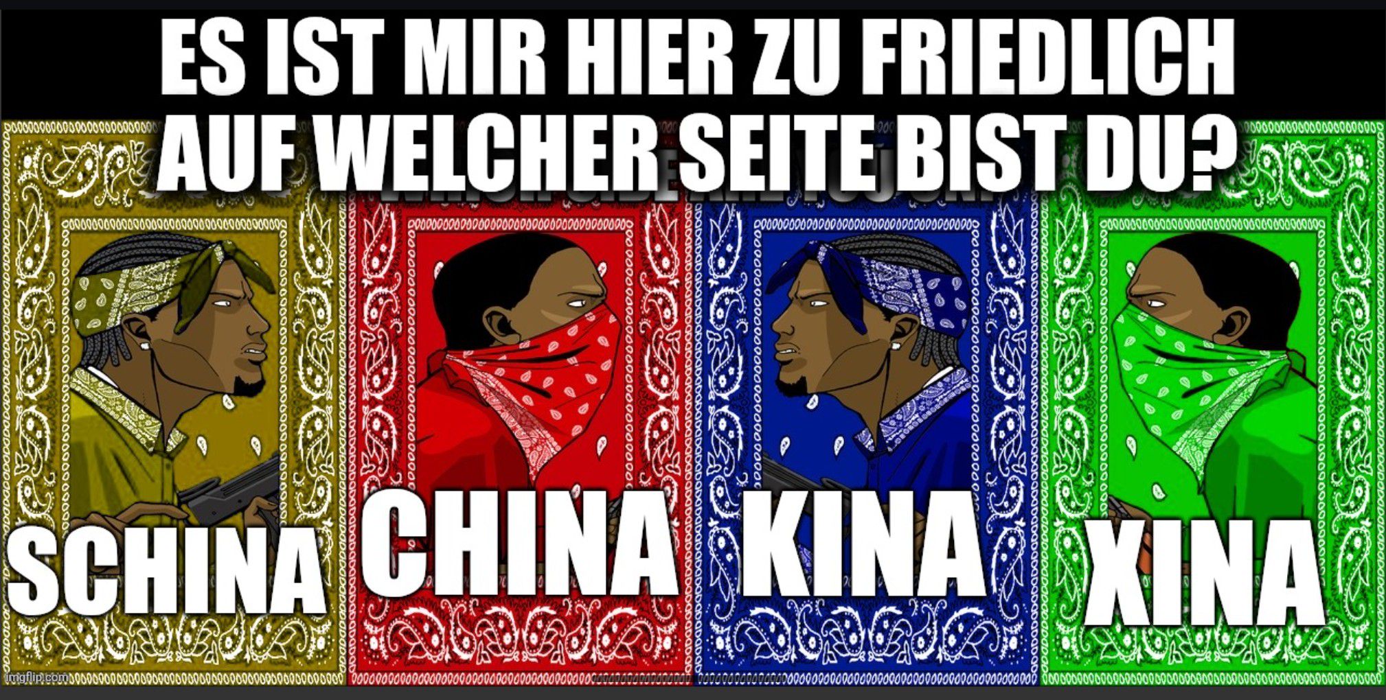 Es ist mir hier zu friedlich. Auf welcher Seite stehst du? Bild: Vier Gangster die sich wütend beäugen: China, Kina, Schina, Xina